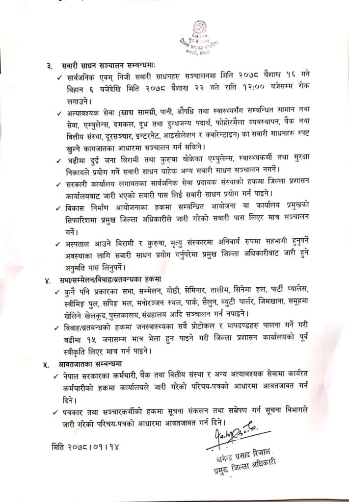 प्रमुख जिल्ला अधिकारी खगेन्द्र प्रसाद रिजालको अध्यक्षमा मंगलबार बसेको केन्द्रको बैठकले सो निर्णय गरेको हो।निषेधाज्ञा बैशाख १६ गते बिहान ६ बजेदेखि बैशाख २२ गते राती १२ बजे सम्म लागु हुने प्रशासनले जनाएको छ । उक्त अवधिमा अत्यावश्यक सेवाबाहेकका सबै बन्द रहने जनाएका छन्।