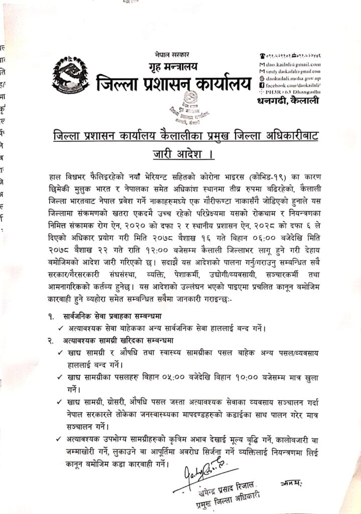 धनगढी,१५ बैशाख । कैलालीमा बैशाख १६ गते अर्थात (भोली) देखि एक हप्ताको लागि निषेधाज्ञा हुने भएको छ । जिल्लामा फैलिरहेको संक्रमण दर र मृत्युदरलाई मध्यनजर गर्दै जिल्ला प्रशासन कार्यालय कैलालीले एक हप्ता निषेधाज्ञा जारी गरेको हो।