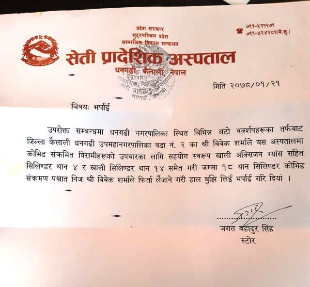 अस्पतालहरुमा उपपचाररत संक्रमितहरुले अक्सिजनको अभावमा ज्यान गुमाउने क्रम बढेपछि धनगढीको शिवाङ्ग ट्रेडर्सका सञ्चालक विवेक शर्माले विभिन्न अटो वर्कसपबाट खालि तथा भरिएका अक्सिजन सिलिण्डर संकलन सुरु गरेका थिए। सोही अभियान अन्तरगत संकलन भएका जम्मा १८ वटा सिलिण्डर मंगलबार सेती अस्पताललाई सहयोग गरिएको शर्माले बताए।