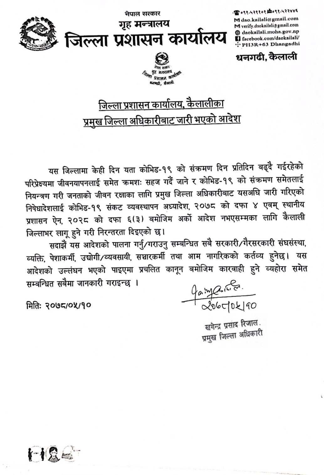 कोरोना संक्रमण दर बढीरहेकाले यसअघि जारी भएको आदेशलाई अर्को आदेश जारी नभएसम्म निरन्तरता दिने निर्णय भएको रिजालद्धारा जारी आदेशमा भनिएको छ।