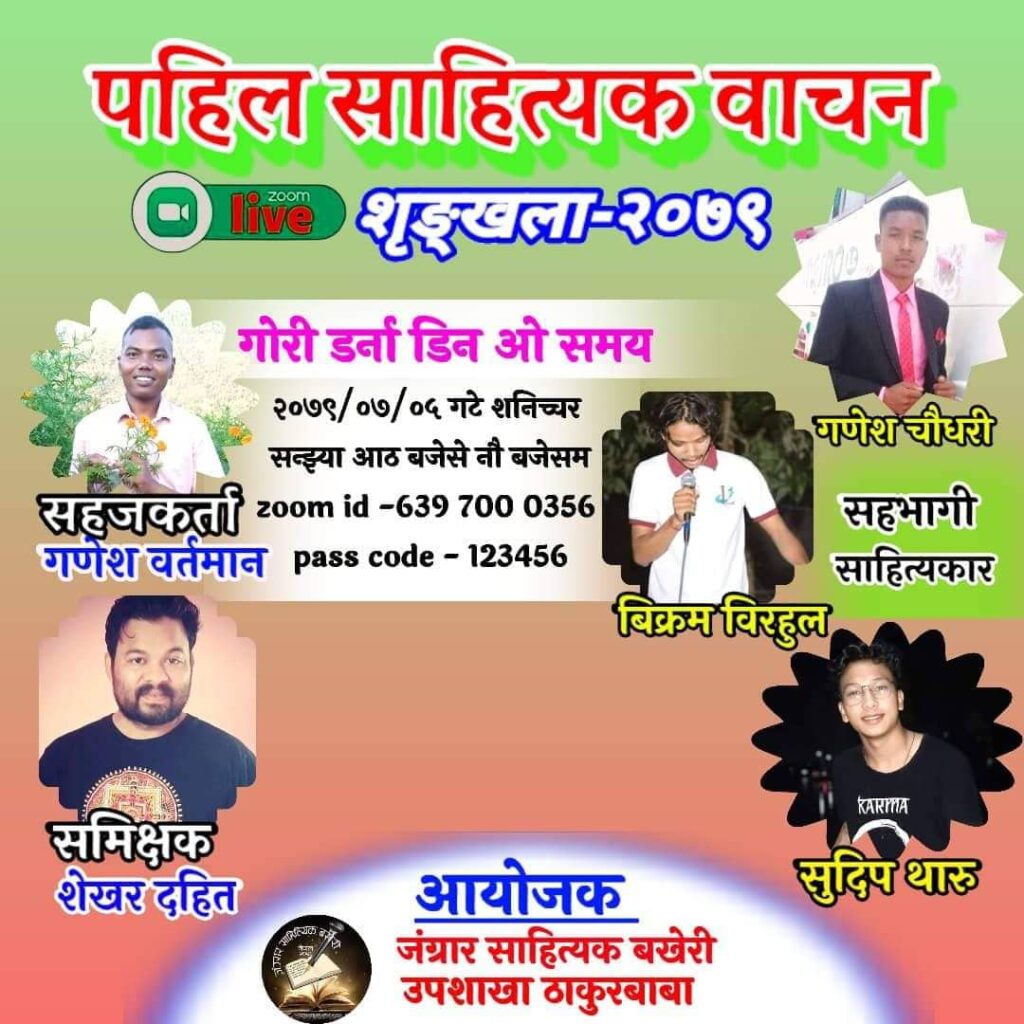 जंग्रार साहित्यिक बखेरी उपशाखा ठाकुरबाबक आयोजनामे अनलाइन जूमसे कार्यक्रम निम्जल हो। हर महिनक पहिल सनिच्चरके राटिक हुइना कार्यक्रममे स्रस्टाहुँक्रे बिक्रम बिरहुल, सुदीप थारू ओ गणेश चौधरी रहल रहितट स्रस्टाहुँक्रनके वाचन करल बत्कोहीक समीक्षा आख्यानकार शेखर दहित करले रहित कलसे सहजकर्ता गणेश बर्तमान रहित।